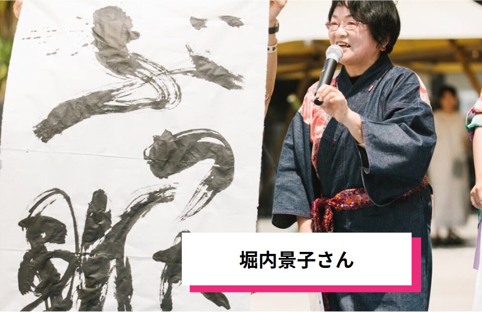 堀内景子さんが巨大筆で「ぶった斬り会長」と力強く揮毫。迫力と愛嬌あふれる姿に観客から大歓声!